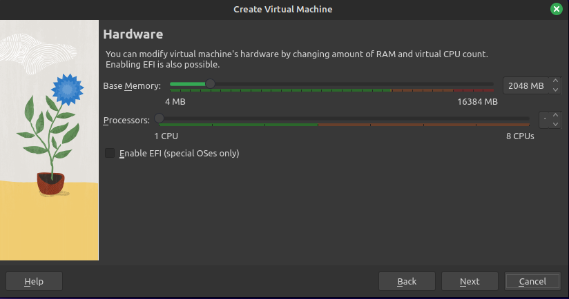 I then went through the basic setup process of dedicating RAM, CPU and storage to the virtual machine for it to run properly.